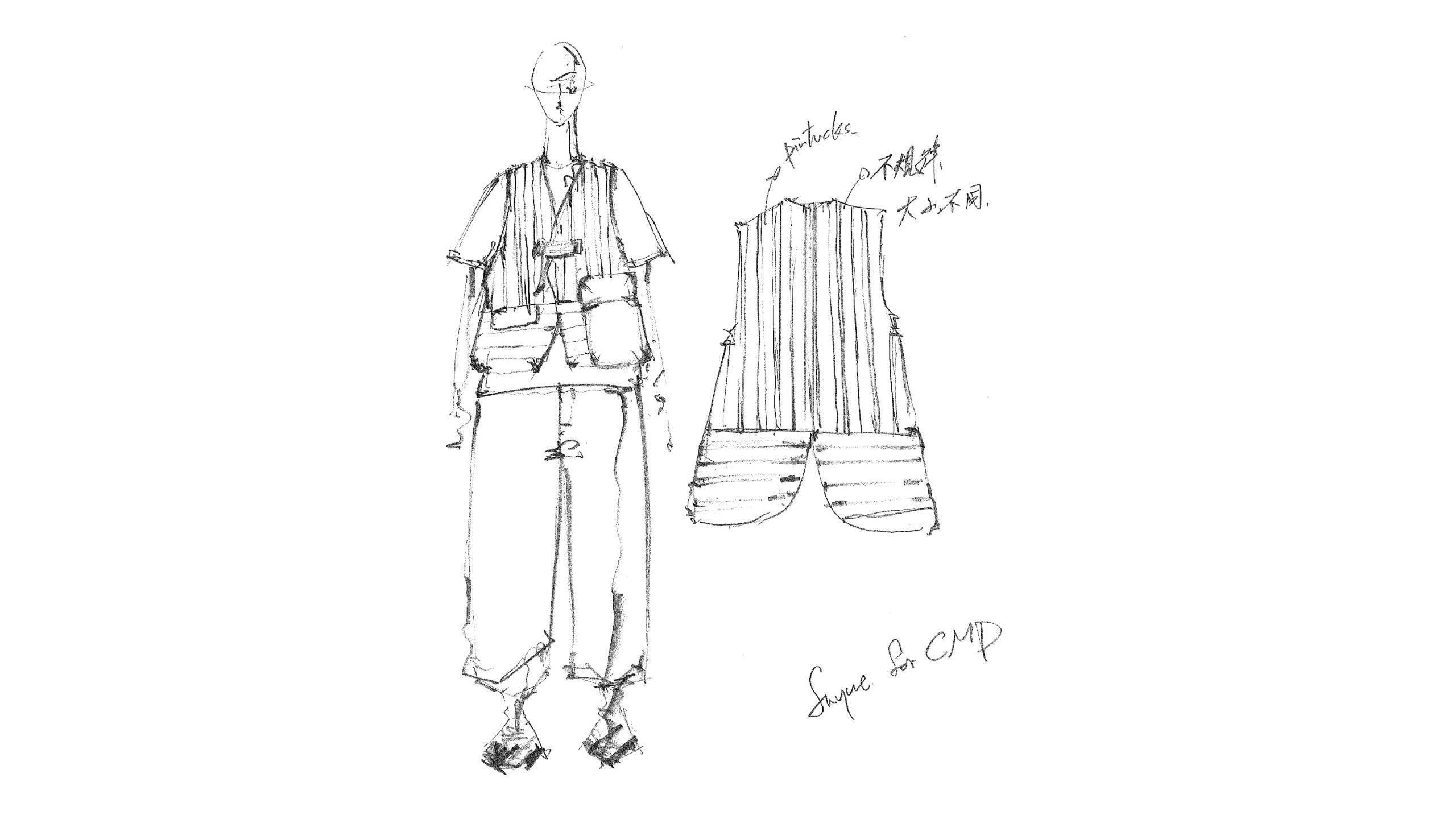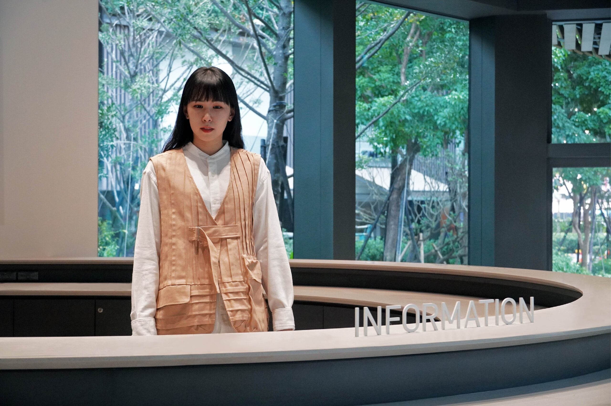 「甫月」創作貫穿東西方意涵,運用線性元素與縫褶技法,在制服設計上傳遞勤美術館建築的自然質地,並藉由極致細節詮釋設計感,強化衣著流動與結構簡潔性;純綿材質與肌理質樸的布料選用,讓服裝樸實卻充滿生命力。